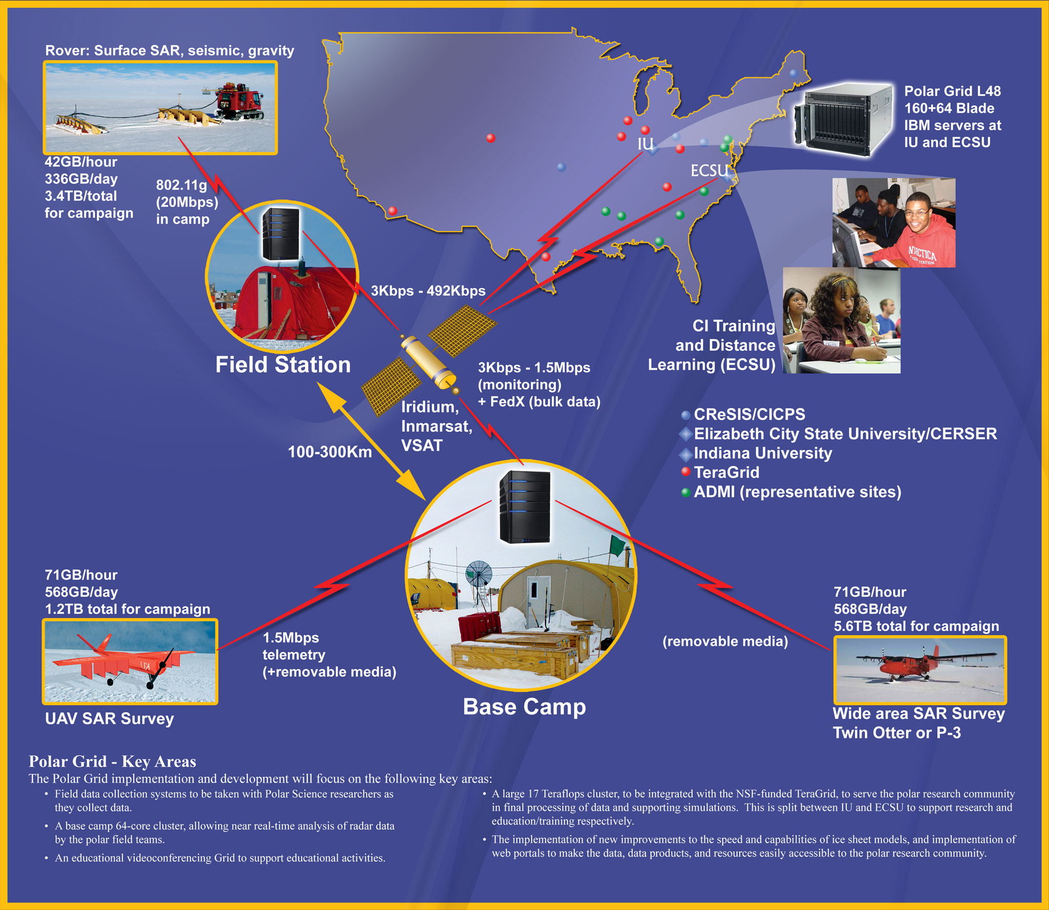 Polar Grid is an National Science Foundation (NSF) Major Research Instrumentation (MRI) funded partnership of Indiana University and Elizabeth City State University. The partnership goal is to acquire and deploy the computing infrastructure needed to investigate the urgent problems in glacial melting. Polar Grid's major components and concept of operations are depicted in the figure below. A complete description of the project is available at http://www.polargrid.org.